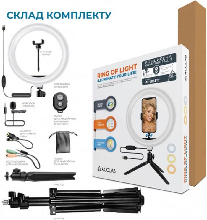 Кільцева USB LED-лампа ACCLAB Ring of Light AL-LRSET2 + штатив, мікрофон і Bluetooth керування (1283126502064)