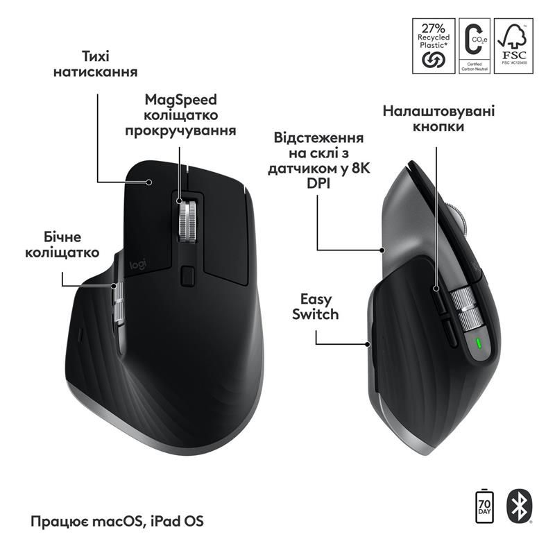 Безпровідна миша Logitech MX Master 3S з технологією MagSpeed, найшвидшим і найточнішим колесом прокручування від Logitech з сенсором 8K DPI, який відстежує рухи на будь-якій поверхні, навіть на склі.