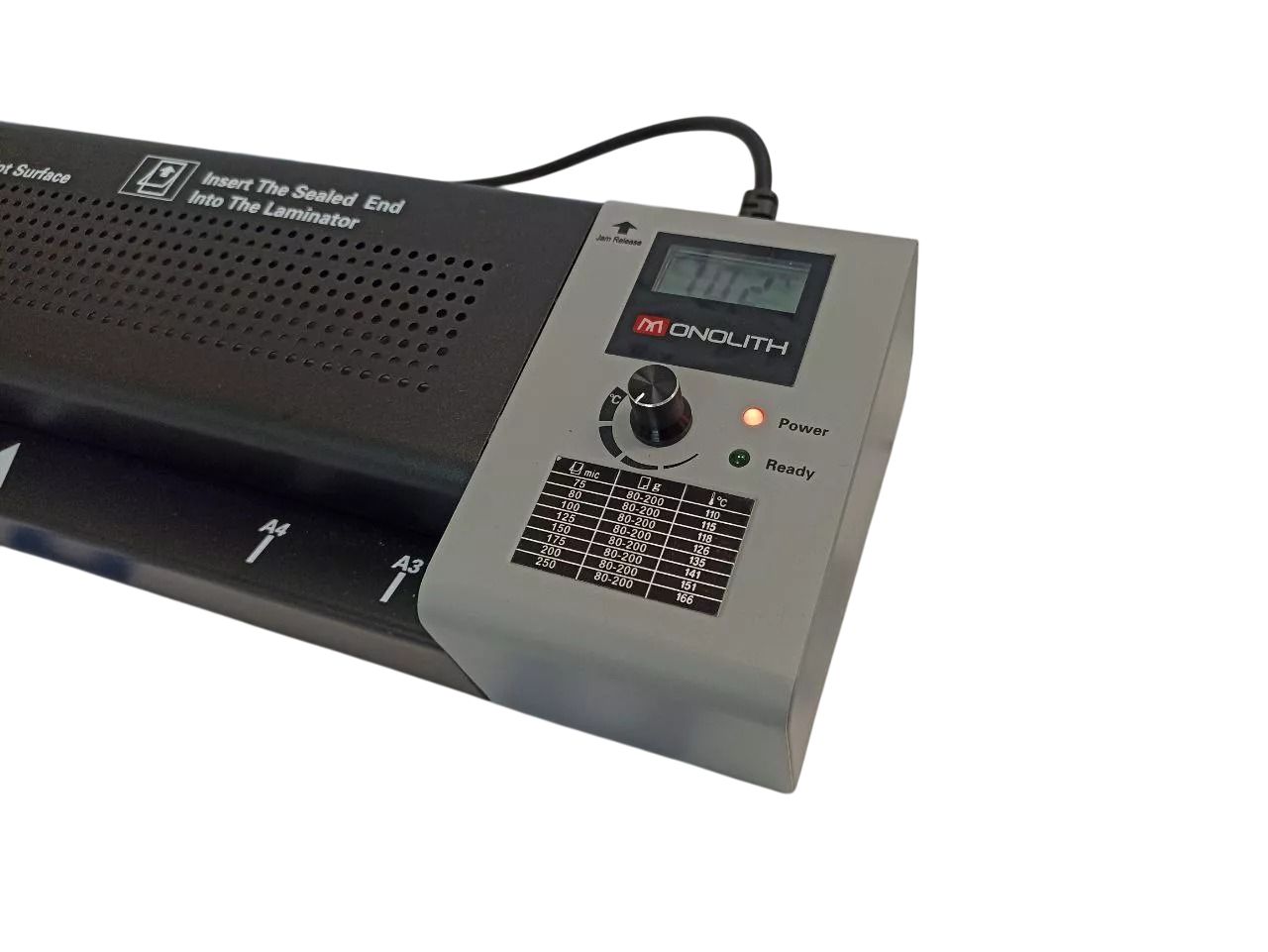 Офісний ламінатор. Простий та зручний в експлуатації. Рекомендації: для організацій з невеликим обсягом робіт. Максимальний формат ламінування - 330 мм. Індикатор готовності, розігрів 2-7 хв. LED дисплей, регулювання температури - плавний перемикач. Працює з різною товщиною плівки від 75 мк до 250 мк. Можливість ламінування фотографій. Конструкція з 4 валами. Є кнопка розтискання валів. Міцний металевий корпус.