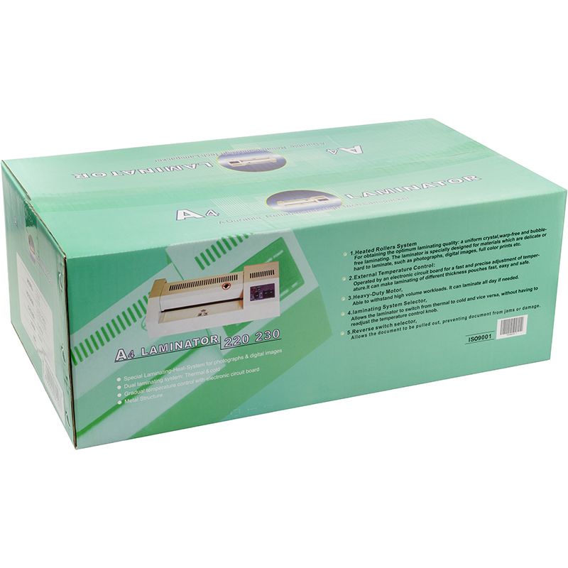 Завдяки 4 валів ламинатор рівномірно, без яких-небудь дефектів склеює плівку навіть в зонах з мінімальними краями. Інтуїтивно зрозуміла панель управління. Можливість налаштувати робочу температуру в діапазоні від 100 до 160 градусів, або включити режим холодного ламінування. Функція реверс дозволить при необхідності перервати процес ламінування і вийняти пакет.
