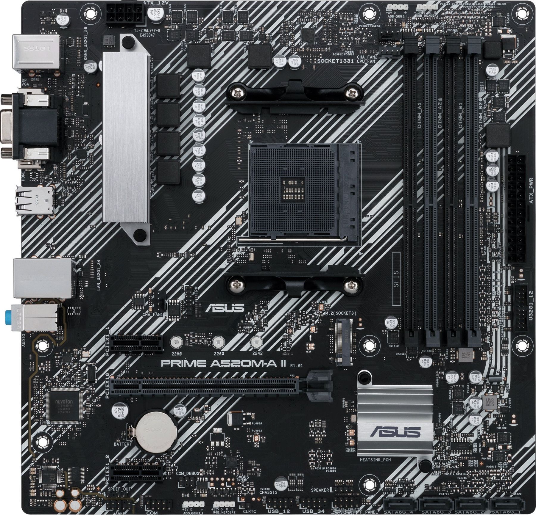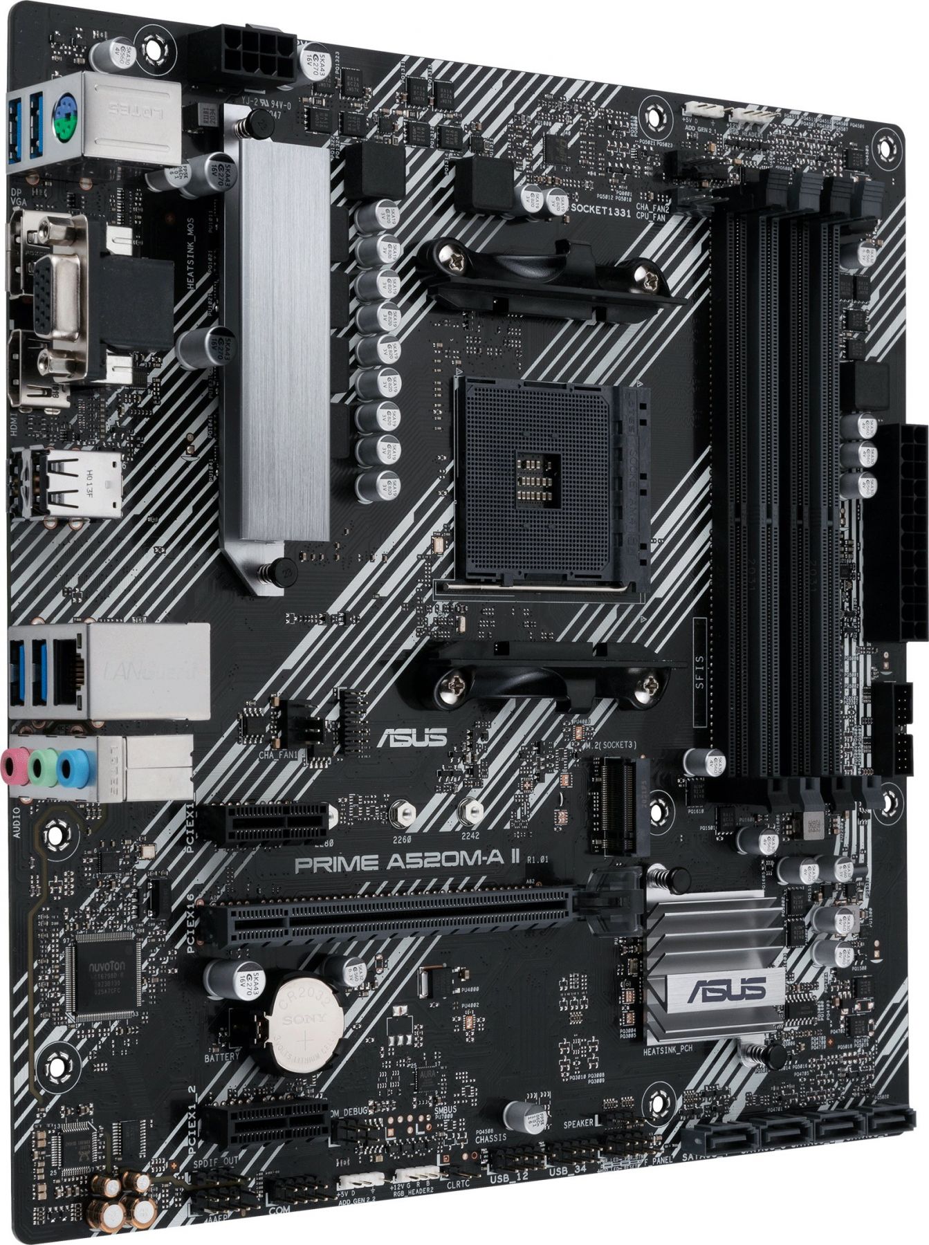 Asus Prime A520M-A II - материнська плата для процесорів AMD з сокетом AM4. Створена на основі чіпсета AMD A520, підходить для установки сучасних компонентів і складання продуктивної системи.