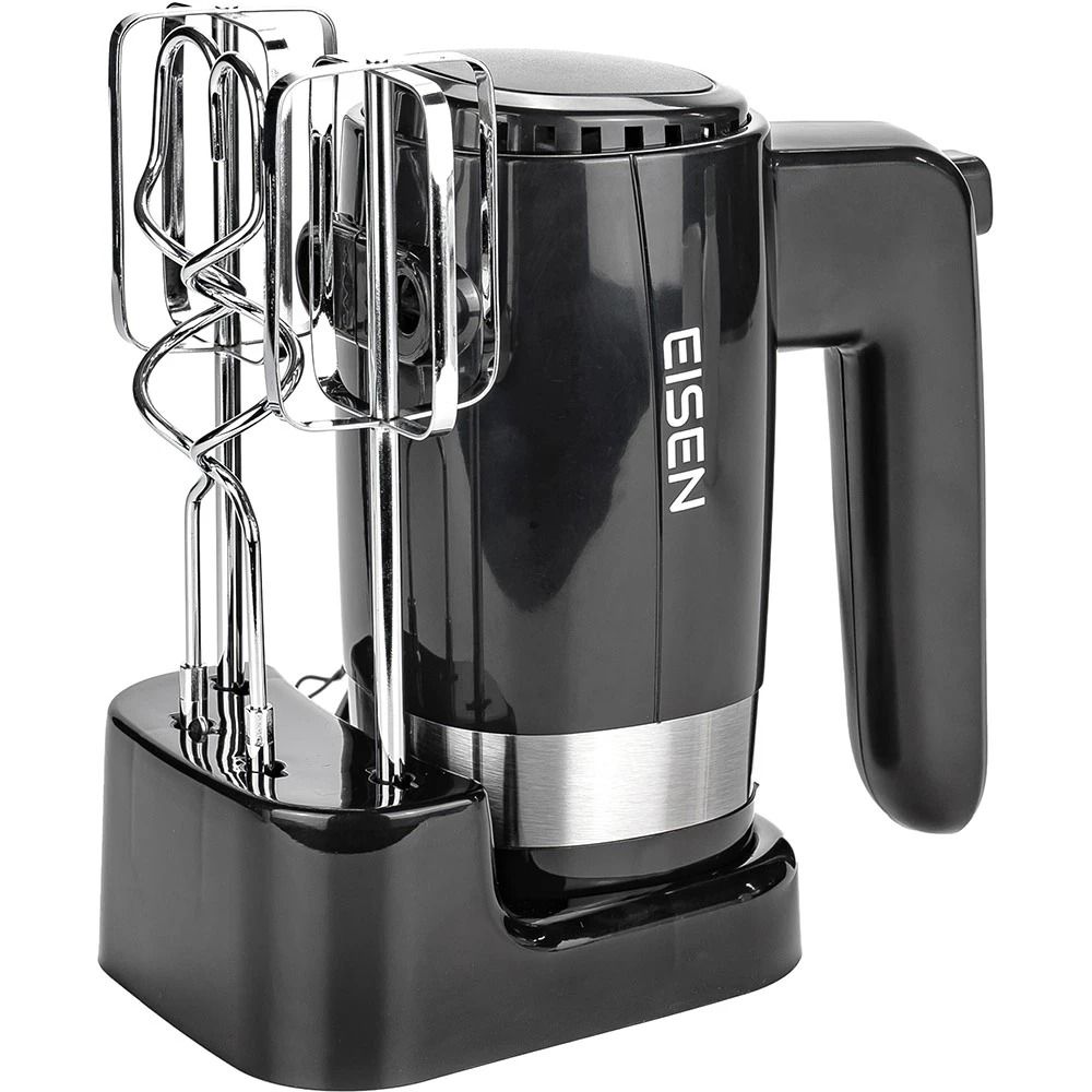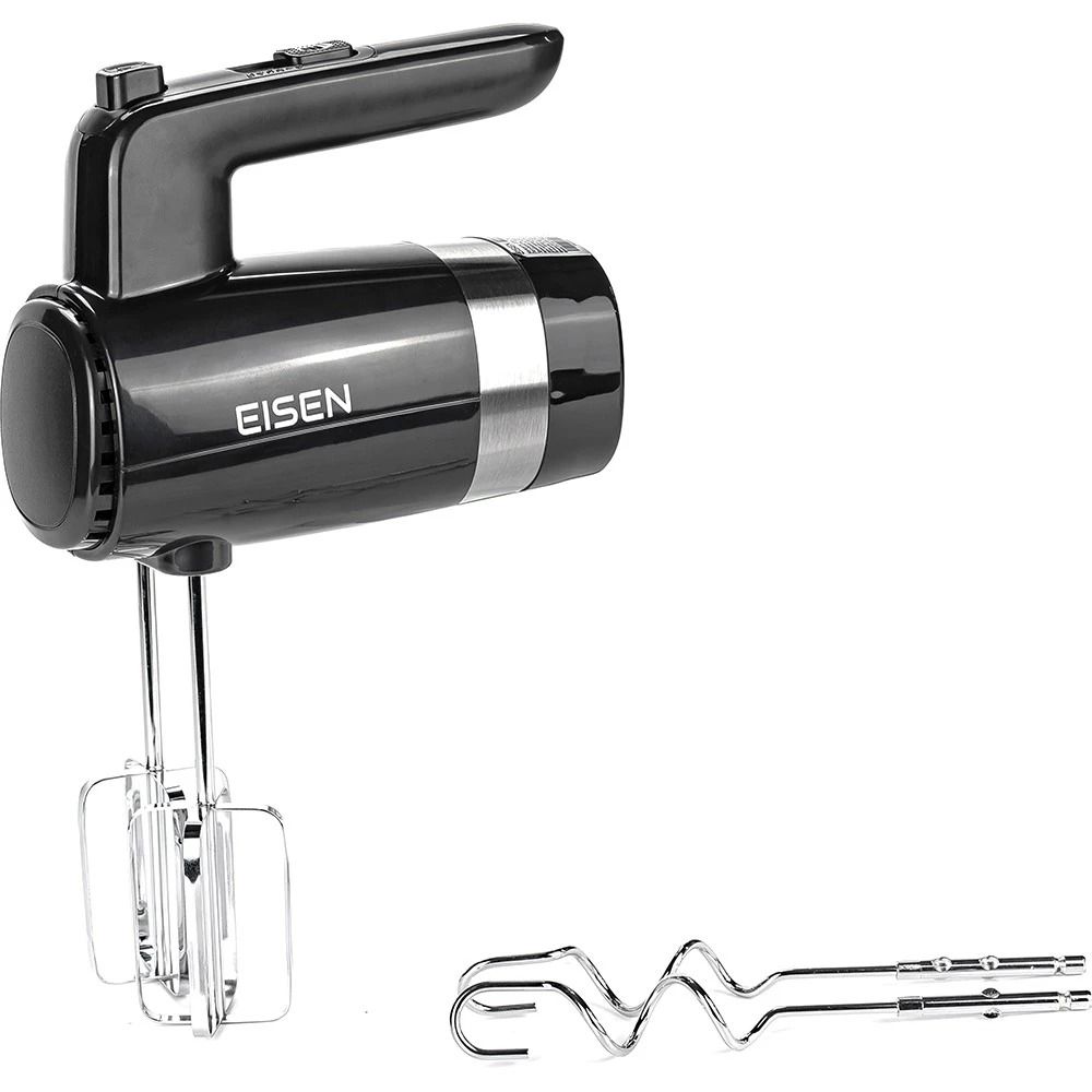 Ручний міксер EISEN EHM-50 є універсальною моделлю "2 в 1" і надійним помічником на кухні. Він має потужність 500 Вт і швидко впорається з різними кулінарними завданнями. У нього є два вінчика для збивання та два гаки для тіста, а також п’ять ступенів регулювання швидкості та турбо-режим. Головною особливістю цієї моделі є підставка для зберігання міксера та насадок. Щоб забезпечити безпечну роботу пристрою, він має функцію захисту від перегріву.