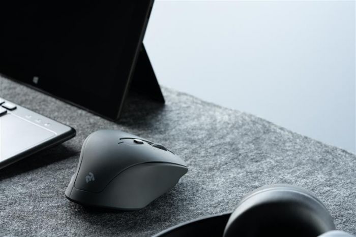 Повнорозмірна, велика мишка анатомічної форми в чорному стриманому дизайні та повністю покрита приємним на дотик Soft Touch фінішем, стане запорукою комфортної роботи. Додаткова підставка під великий палець, з фактурною вставкою, роблять мишку максимально зручною для тривалого використання. Вбудована літій-полімерна батарея забезпечить до 60 днів безперервної роботи, за повного заряду, а за потреби термінового заряджання мишки її також можна легко користуватися в дротовому режимі, під'єднавши до ПК для заряджання.
