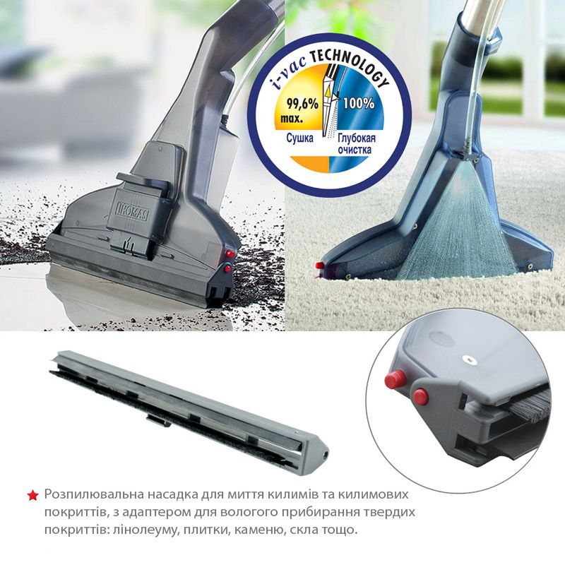 Пилосос відмінно справляється також з сухим і вологим прибиранням килимів і м"яких меблів. Він промиває килими до основи ворсу, знищує бруд і плями і надає текстильним поверхням свіжому, оновленому вигляду.