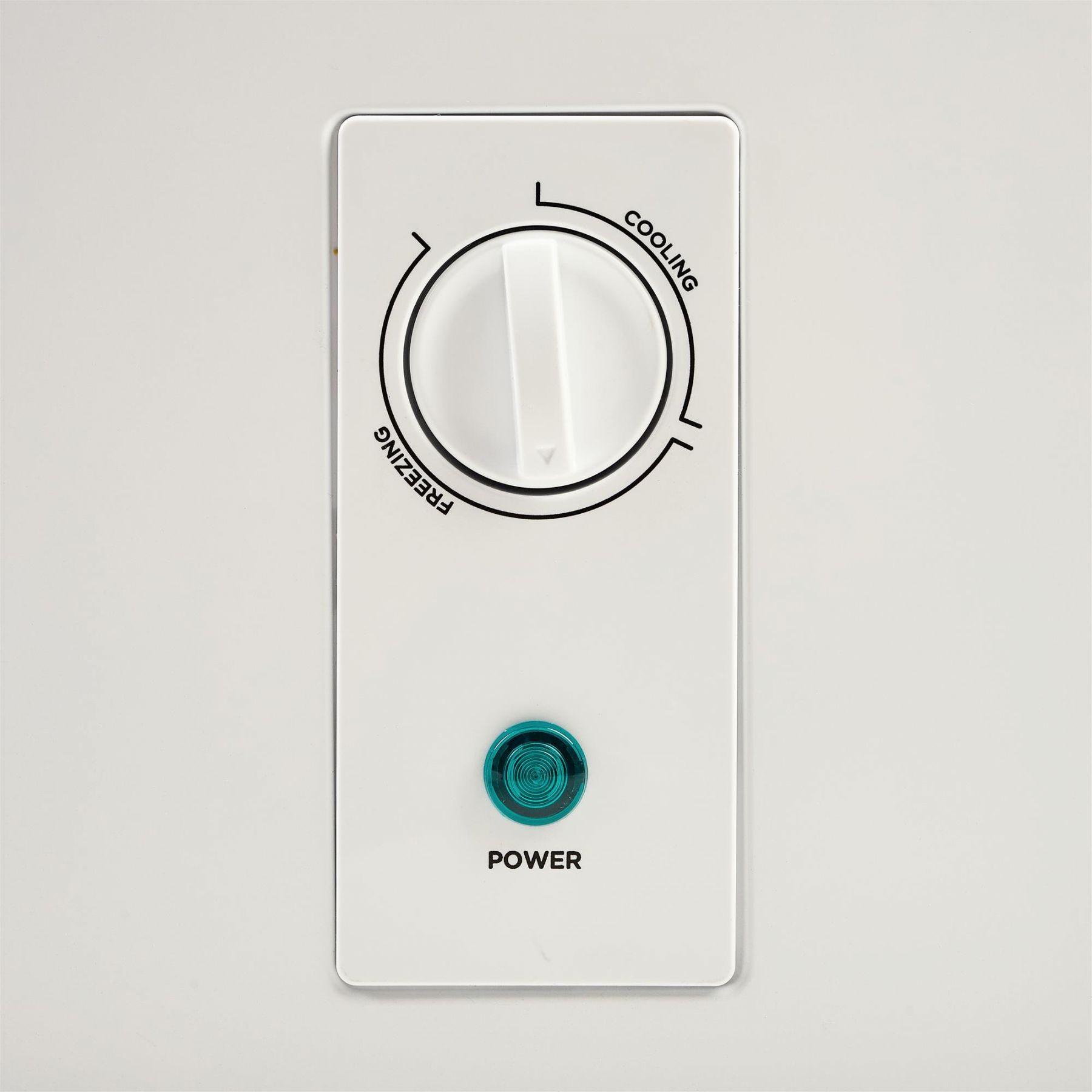 Ззовні на лицьовій стороні розміщений механічний регулятор температур та індикатор роботи скрині. Завдяки потужному компресору AU120CY1A та холодоагенту R600a морозилка здатна за годину заморозити до 9 кг продуктів. Енергоефективність класу F дозволяє споживати до 250 кВт на рік, при номінальному струмі 0,8 А.