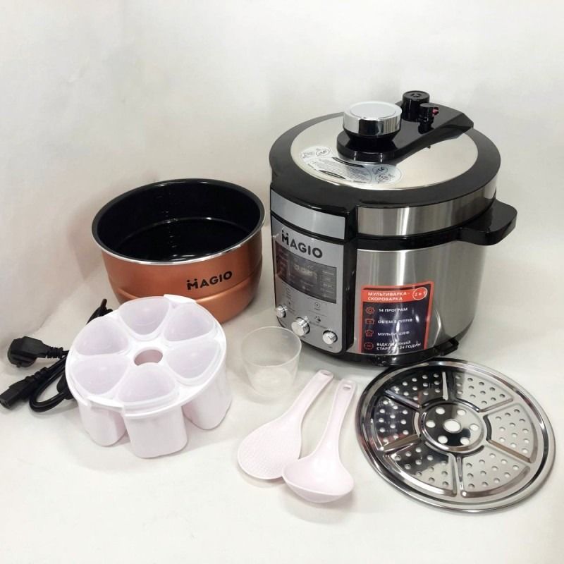 В комплекті:мультиварка, чаша, кошик для готування на парі, глибока та пласка ложки, мірний стакан, стаканчики для йогурту