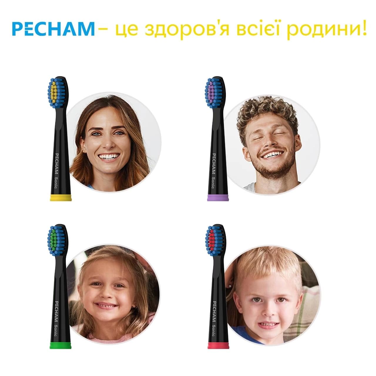 Насадки мають різний колір щетинок і кілець, тому у кожного члена сім’ї своя насадка, яку легко відрізнити.