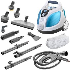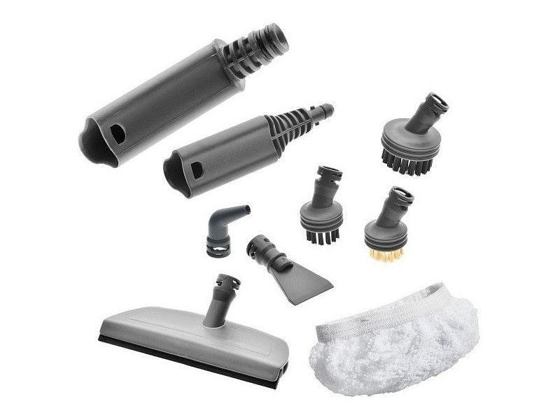 Насадки та щітки:точкова насадка, скребок, нейолонова щітка маленька і велика, металева щітка, насадка і серветка для миття вікон, насадка для миття підлог, серветка для насадки для миття підлог, три подовжувальні трубки