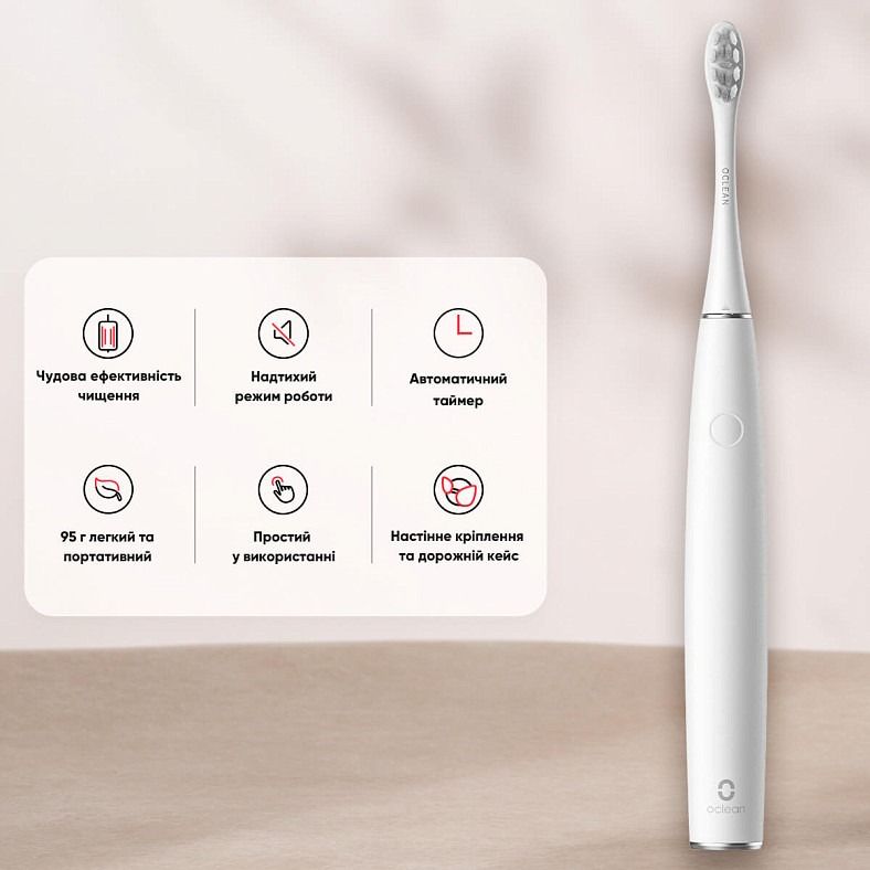 Ультразвукова зубна щітка Oclean Air 2T Electric Toothbrush ергономічна та легка. Важить всього 95 грам, тому при чищенні вона зовсім не обтяжує вашу руку. Нековзна поверхня дозволяє легко тримати зубну щітку в руці, а елегантний дизайн надає їй стильного вигляду.