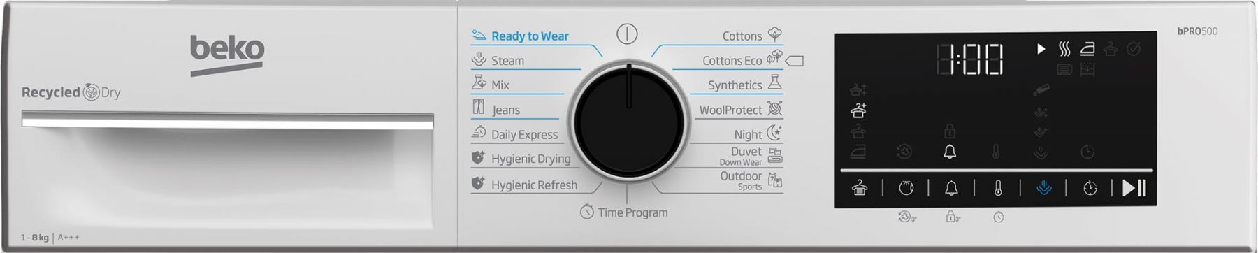 Програми:бавовна, бавовна Еко, синтетика, вовна, нічний режим, пухові вироби, спортивні речі, регулювання часу сушіння, гігієнічно освіжаючий цикл, гігієнічна сушка, експрес, джинси, мікс, освіжити з парою, Ready to Wear (ефект прасування)