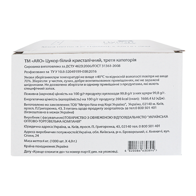 Цукор Aro білий кристалічний в стіках 1000*4г/уп. Склад: цукор білий кристалічний. Вміст калорій на 100г продукту: 1666.4кДж/398ккал. Поживна цінність на 100г продукту: вуглеводи - 99.8г. Умови зберігання: при температурі не вище +40°С та відносній вологості повітря не вище 70%. Зберігати у чистих, сухих, добре вентильованих приміщеннях, які не заражені шкідниками. Не дозволено зберігати в одному приміщенні з продуктами, які мають специфічний запах. Країна виробник: Україна.