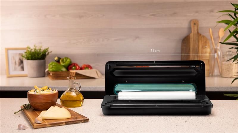 Складаний ніж і вбудований рулон для більш швидкого і зручного використання. Ви можете виготовляти вакуумні пакети нестандартного розміру, щоб максимально використовувати їх.
