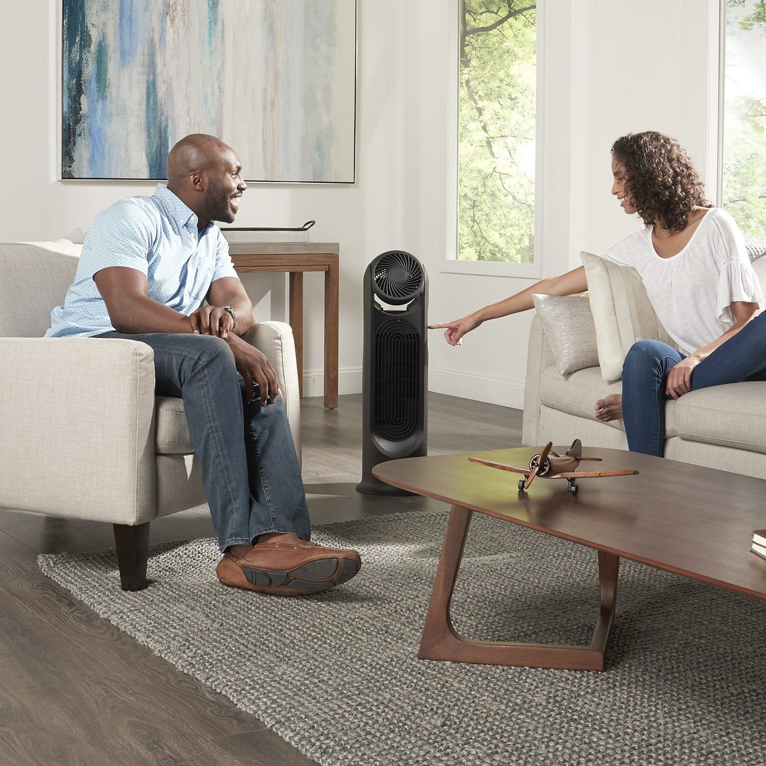Напрямком верхнього вентилятора можна вручну керувати на 90 градусів, тому ви легко налаштуєте його роботу відповідно до своїх потреб. А нижній вентилятор обертається на 80 градусів з горизонтальним охолодженням, завдяки чому створюваний повітряний потік досягне всіх куточків кімнати.