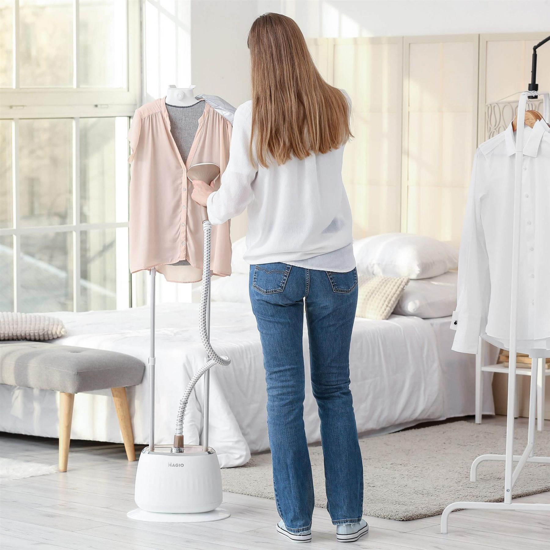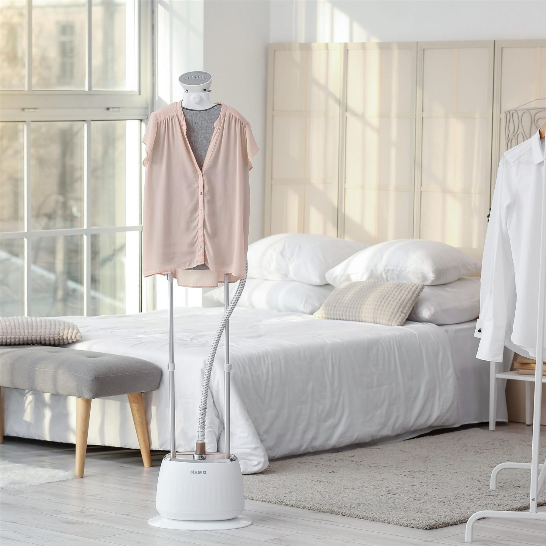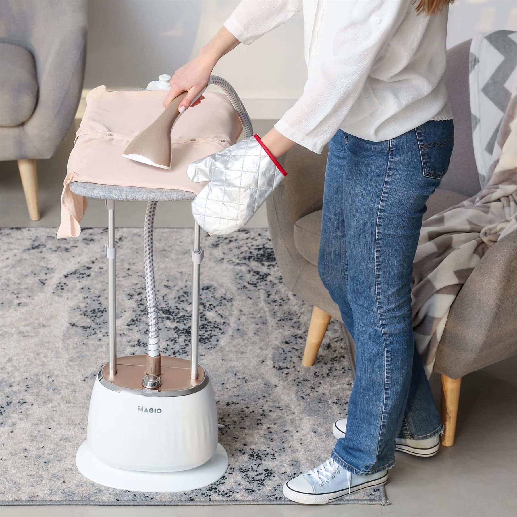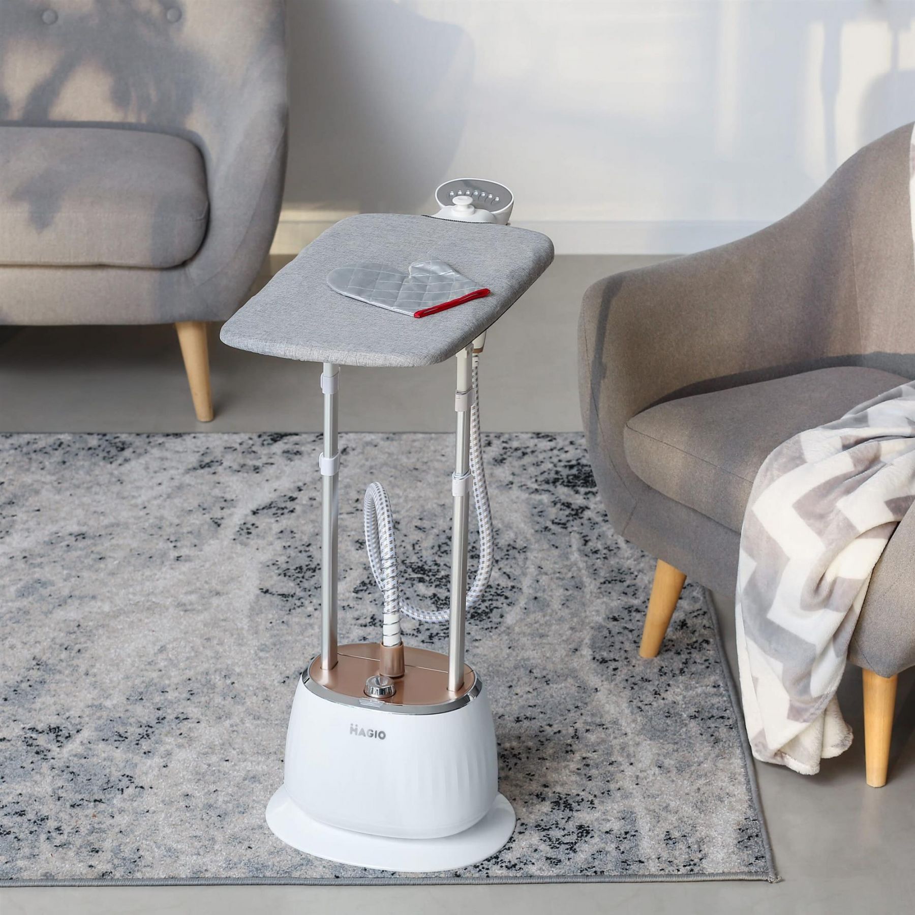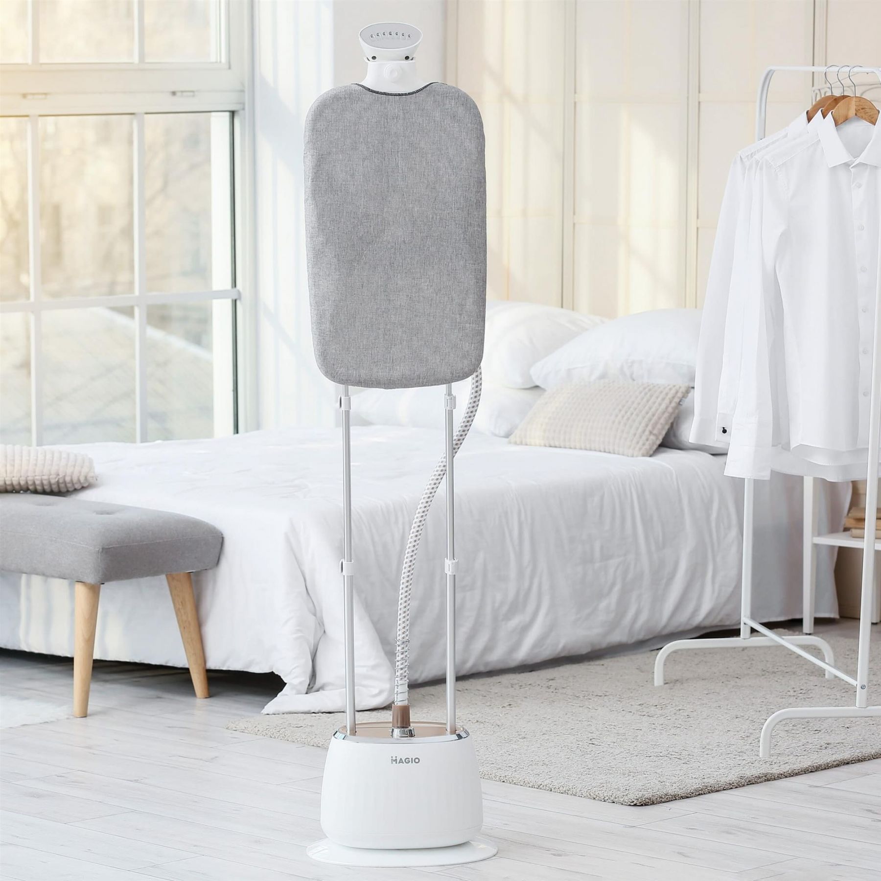 Стаціонарний відпарювач MG-330 – це сучасний пристрій, що дозволяє прасувати одяг і домашній текстиль, не витрачаючи багато зусиль. Також він швидко і ефективно дозволить обробити гарячою парою одяг, очищаючи і дезинфікуючи його. Має як горизонтальне, так і вертикальне відпарювання. Відпарювачем неможливо пошкодити навіть найтоншу і примхливу тканину – ні синтетичну, ні натуральну. Виріб контактує тільки з парою, температура якої 102°С. Прилад складається із парогенератора й резервуару з водою об’ємом 1,6 літрів. Потужність складає 1800 Вт, що є запорукою високої швидкості прасування. Відпарювач має сучасний мобільний дизайн з колесами, що забезпечує комфортне та легке пересування приладу квартирою. Продуктивність подачі пари становить 35 грами в хвилину, що дозволяє розгладити навіть найскладніші складки. В комплекті є дошка для відпарювання та термозахисна рукавичка. Стаціонарний відпарювач з таким набором можливостей значно полегшить життя, особливо, якщо в будинку діти.