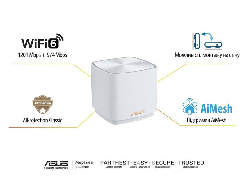 Mesh-система ZenWiFi XD4 Plus складається з трьох вузлів, кожен із яких є бездротовим маршрутизатором ASUS класу AX1800 (стандарт Wi-Fi 6). Доступні різні варіанти підключення вузлів один до одного, разом вони забезпечують покриття швидкісною, надійною й захищеною мережею Wi-Fi всього простору будинку.