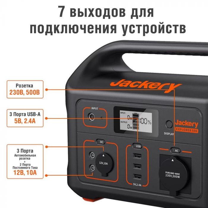 Велика ємність 518 Втч: Explorer 500 оснащений літій-іонним акумулятором ємністю 518 Втч (24 Ач, 21,6 В). Він має 1* вихід змінного струму (230 В/500 Вт, пікова потужність 1000 Вт), 3* порти USB-A, 2* порти постійного струму та 1* автомобільний роз’єм для підключення багатьох пристроїв, таких як міні-холодильник, повітряний насос і телевізор із чистою синусоїдою для роботи. інвертор.